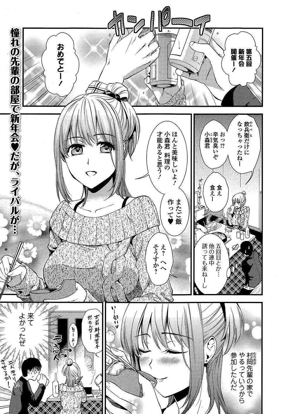 あこがれの先輩の部屋で新年会、来てよかった♪酔っ払って寝てしまう後輩だが、目を覚ますと元カレの男にからまれ追い…